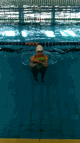 练习描述:运动员俯卧,双腿夹浮板,佩戴呼吸管,双手在身体肩部前方做摇橹状划水。
