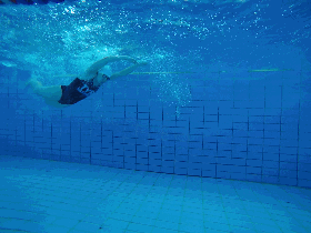 技巧:减慢配合节奏,之后逐渐减少至两次腿一次划手。吸气后目视池底,臀部上移出水面,每次将双手短暂相扣至打水完成。