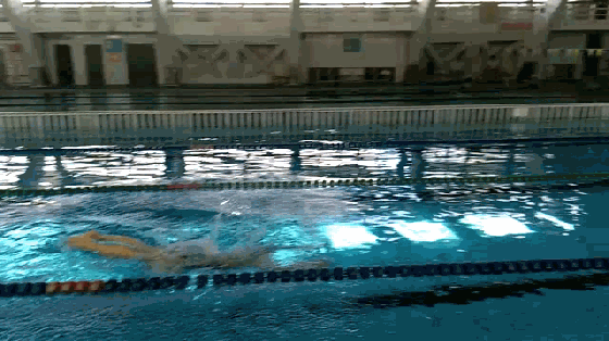 描述:两次完整蝶泳配合之后在第二次完整蝶泳动作手部回臂后顺势转身,腰部发力,腿打直后迅速再接两次完整蝶泳配合,往返四次。